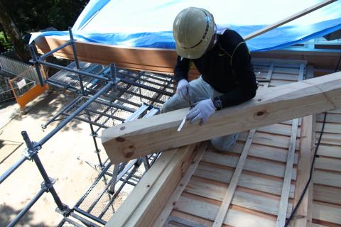 | 棟梁の合図のもと | みんなで綱を引き | 棟木が納まりました |